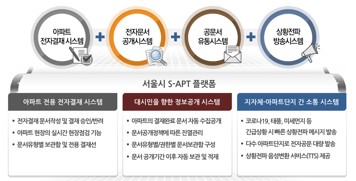 서울시에서 2020년 9월부터 대시민을 향해 서비스하는 S-APT시스템의 구성은 다음과 같습니다.